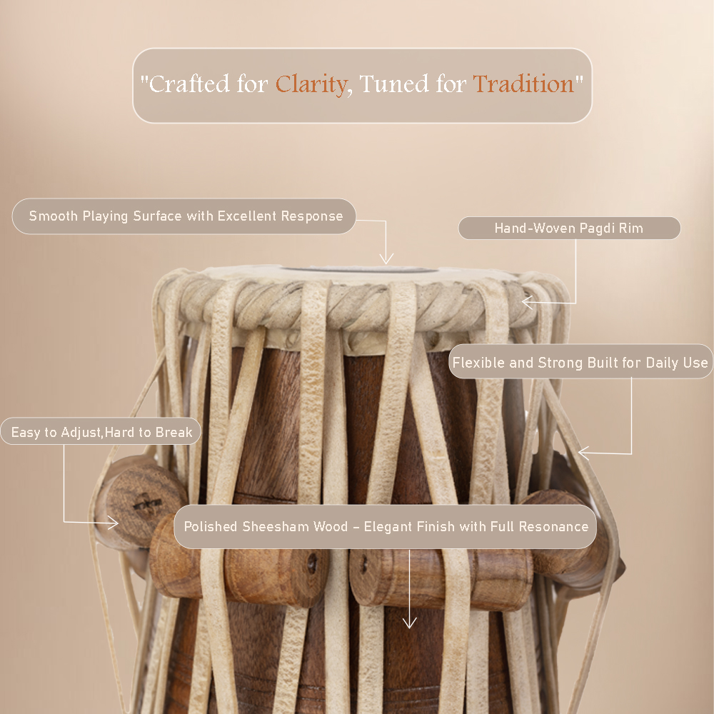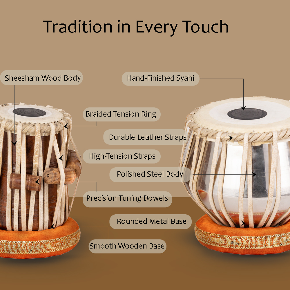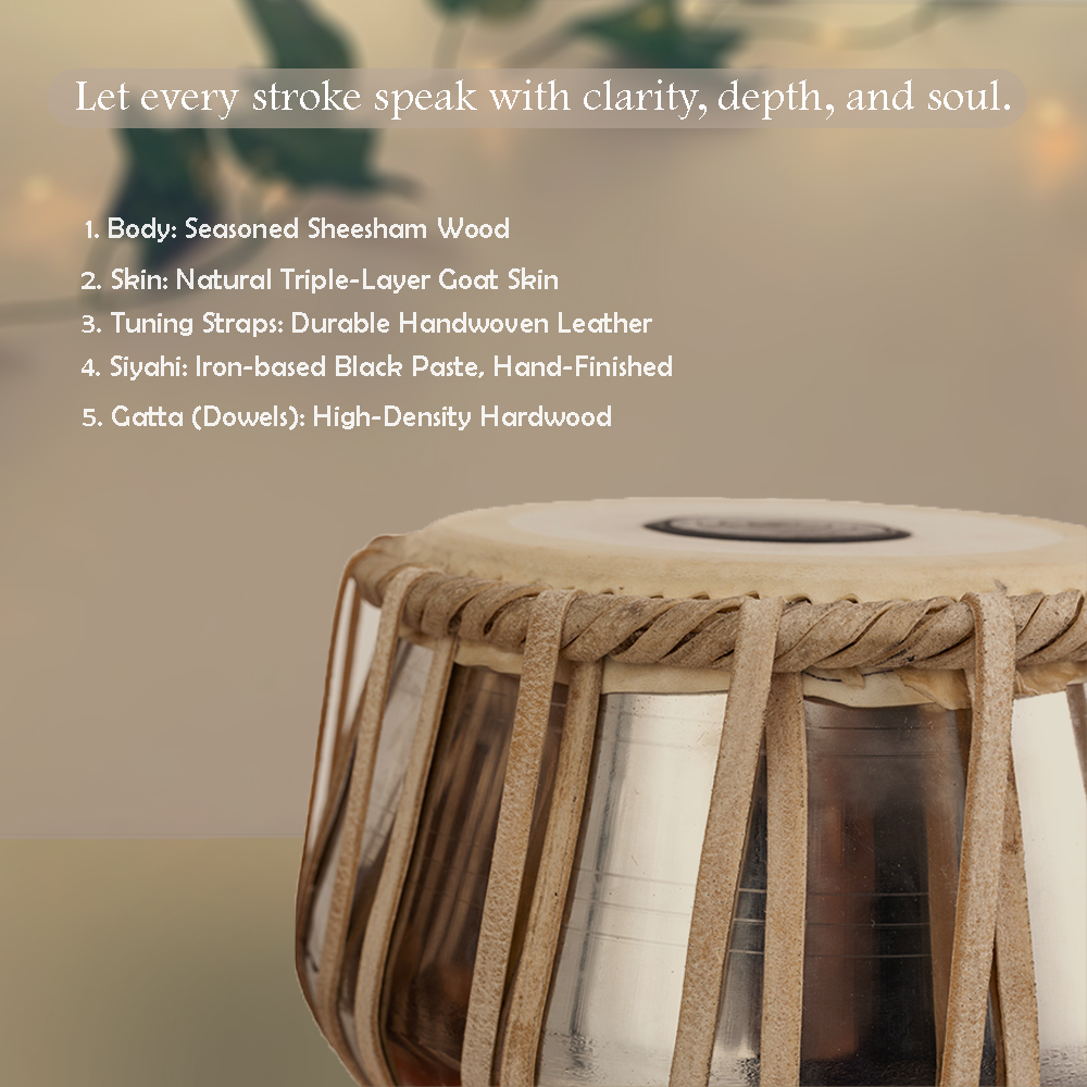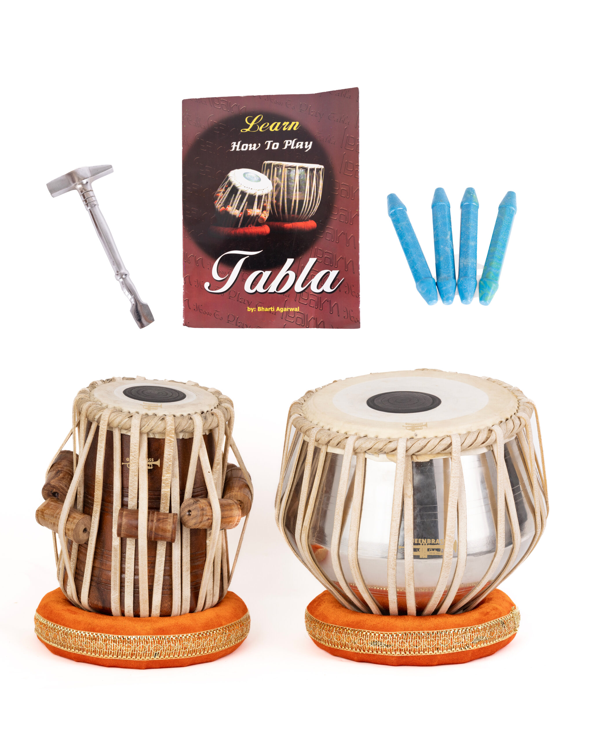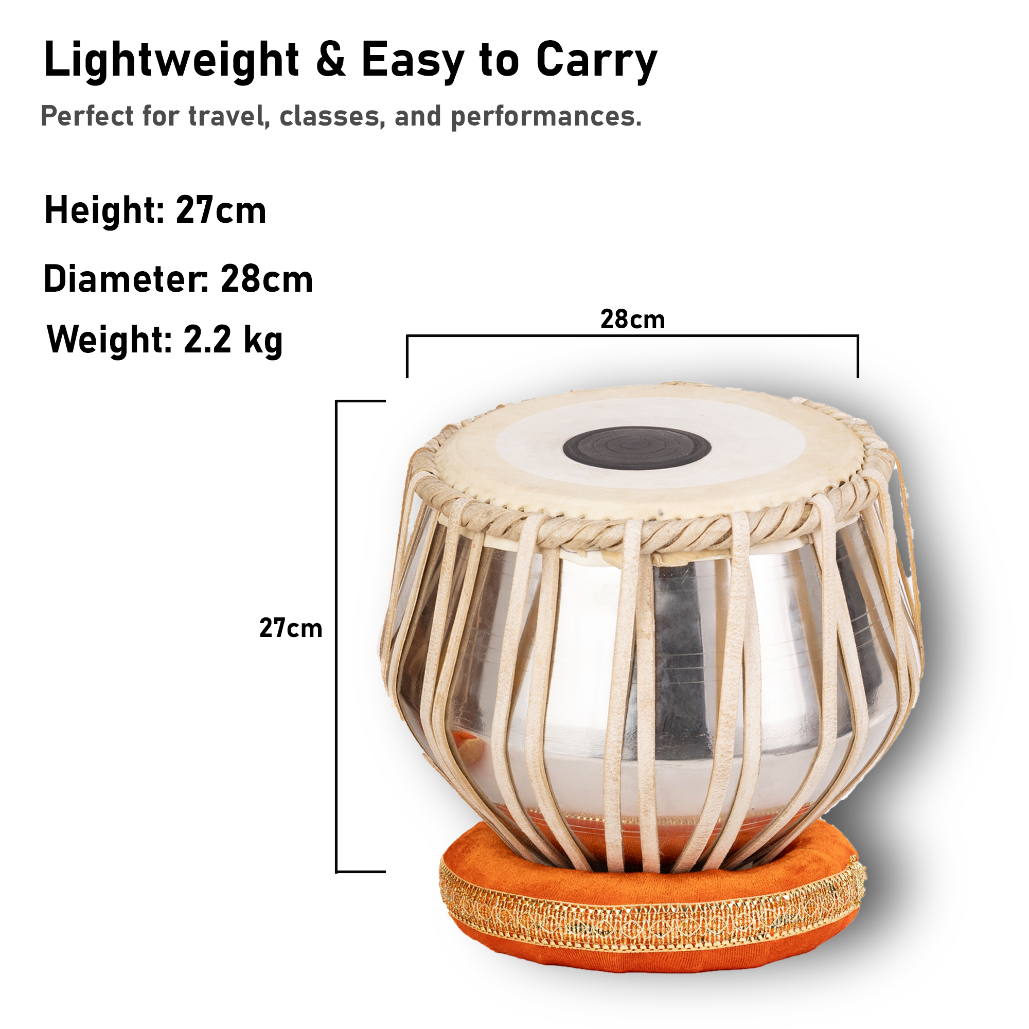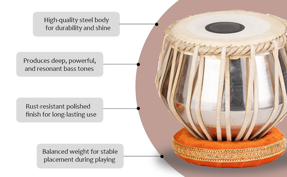 It is the most popular Indian rhythm instrument. The steel bayan drum & finest dayan tabla is a handmade skin for nice sound, long life, easy to tune, beautiful craft work. It is made from premium quality wood such as sheesham dayan delivers a warm, rich sound with exceptional resonance. Included bag with all accessories offers reliable protection for dayan and bayan, safeguarding them from physical damage and environmental elements.This Tabla Set is an ideal choice for musicians who seek both quality and convenience.
